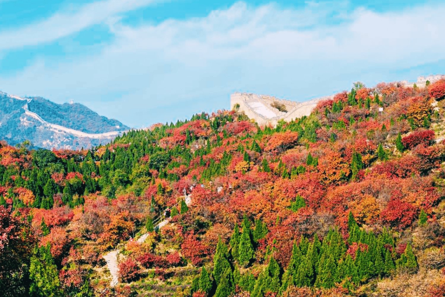 Visitors to Badaling can enjoy stunning views as the Great Wall winds across the mountains like a dragon. The scenery changes with the seasons: blooming flowers in spring, lush greenery in summer, colorful foliage in autumn, and snow-covered landscapes in winter.